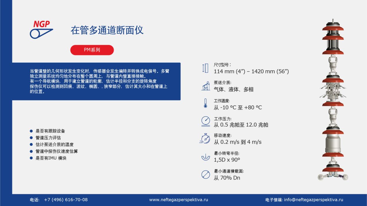 《NGP》有限公司的多通道剖面仪还可以检测和记录结构件的位置(管件、三通、闸阀、公鸡、弯管、环缝)、壁厚的变化,并可在调试期间和管道的正常运行中使用。